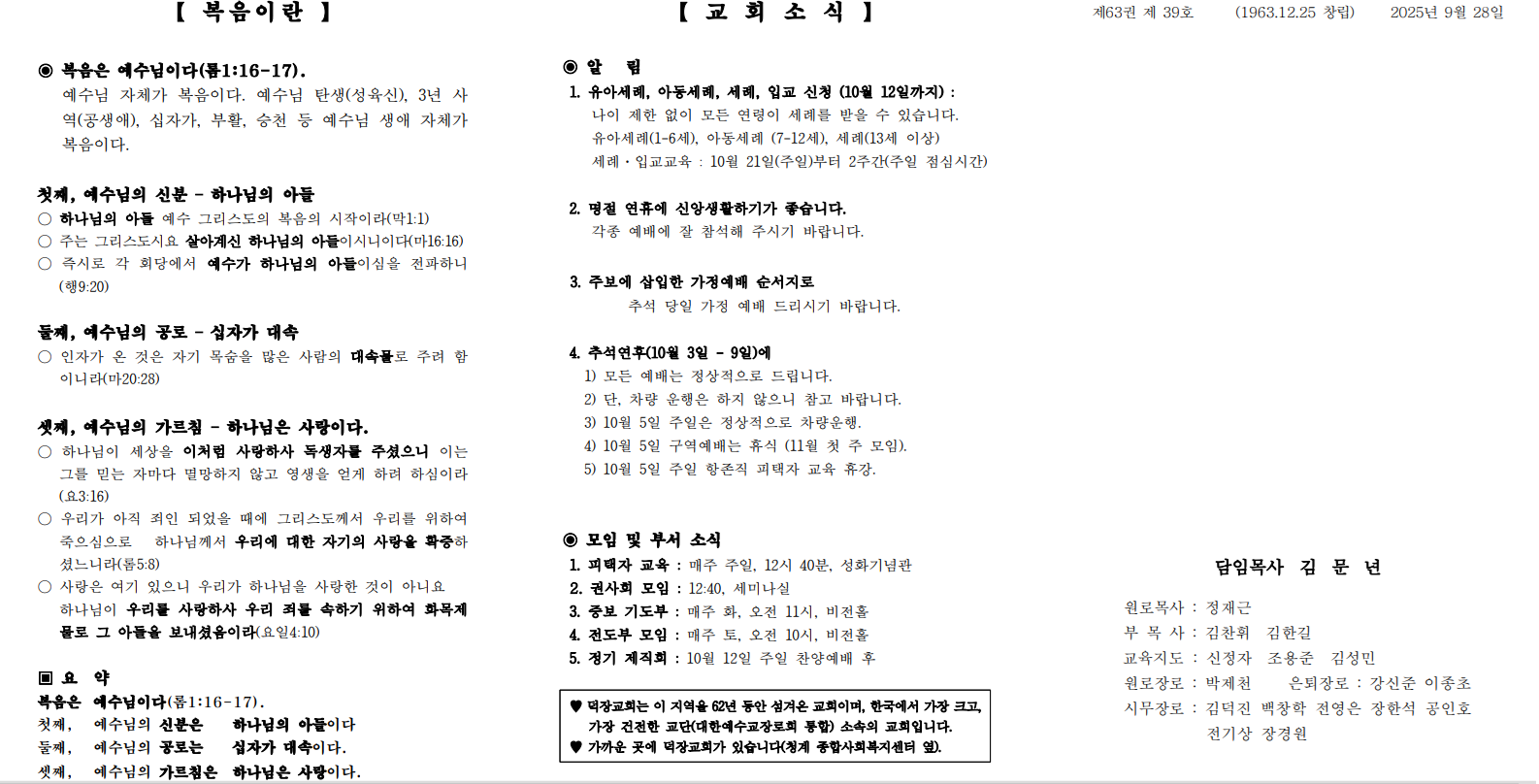 9월 28일 예배순서 및 교회소식